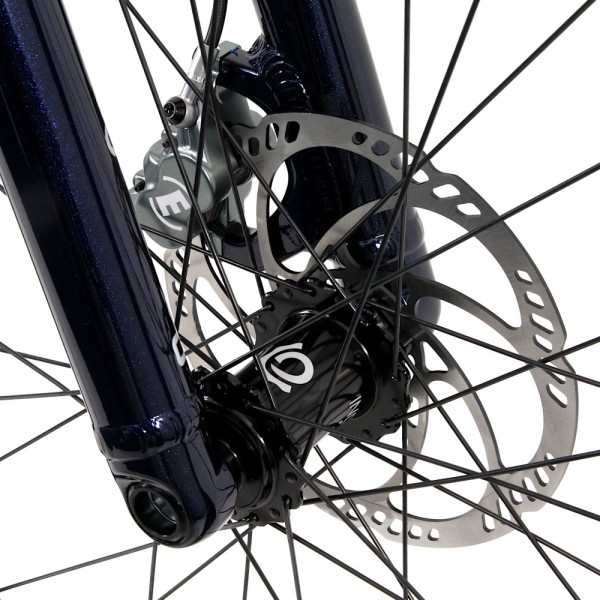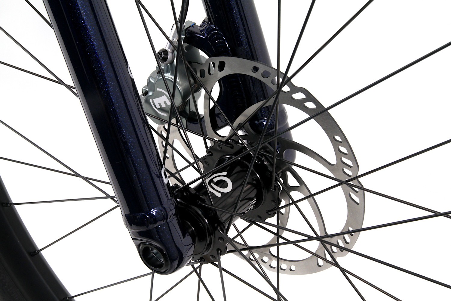 The frame and fork feature reinforced Post Mount disc brake mounts (maximum rotor size 185mm) thereby removing the need for additional brake caliper adaptors. The rear of the bike features exclusive-design seat and chainstay tubing to improve crank and heel clearance. The frame disc mount is a single, hollow component formed with the dropout to ensure perfect alignment and maximum strength. The custom shaped dropouts and integrated tensioner mount maintain the clean and stylish look of the frame.